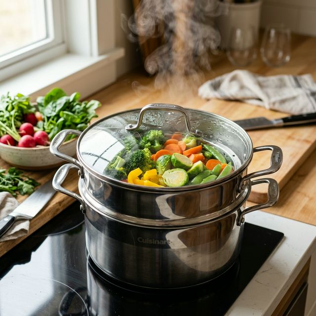 Este é o padrão ouro para a preservação de nutrientes. Ao usar utensílios de aço inox cirúrgico com tampa de vedação precisa, você cozinha o alimento com o mínimo de água e em temperaturas controladas. O vapor envelopa o alimento suavemente, mantendo as cores, texturas e, principalmente, as vitaminas e minerais dentro do vegetal. O resultado é um alimento muito mais rico em vitalidade e sabor orgânico.